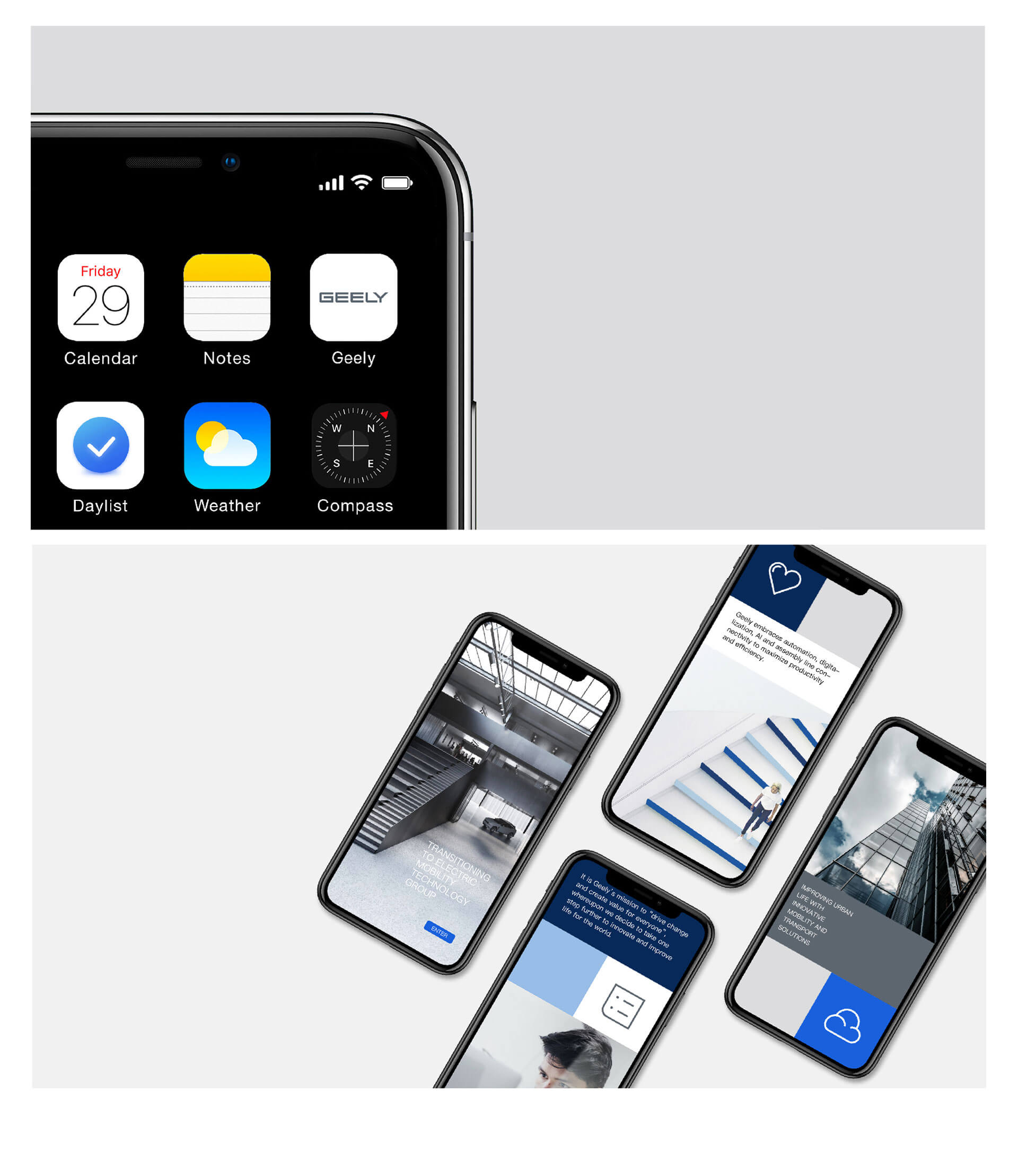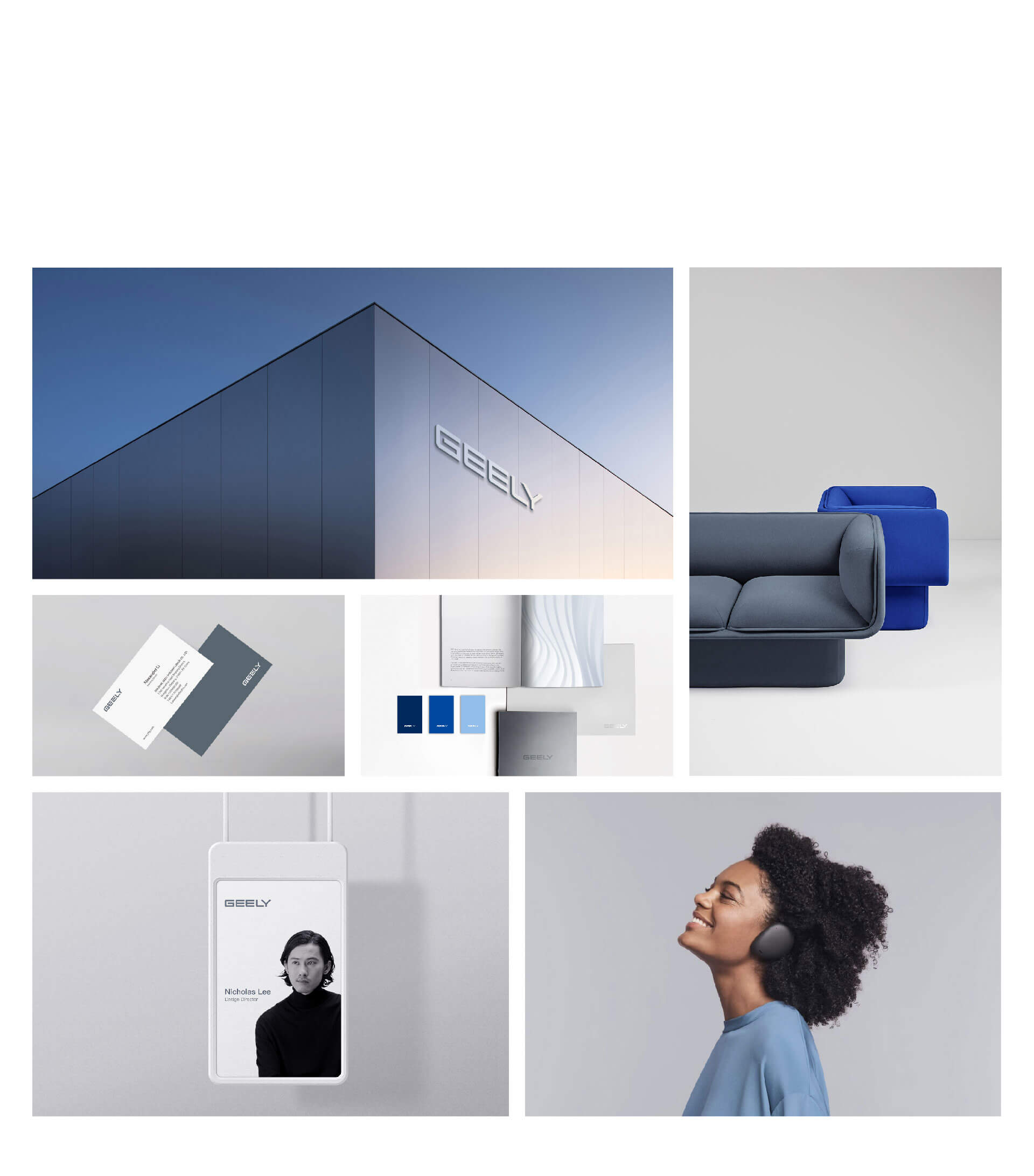 通过对全球汽车集团及主流科技品牌的调研分析,结合吉利控股集团的发展战略,我们将选色理念明确为包容性和辨别性。没有颜色即是包容了所有颜色,最终将品牌标准色确定为科技灰,保留系列经典大海蓝作为品牌识别色。