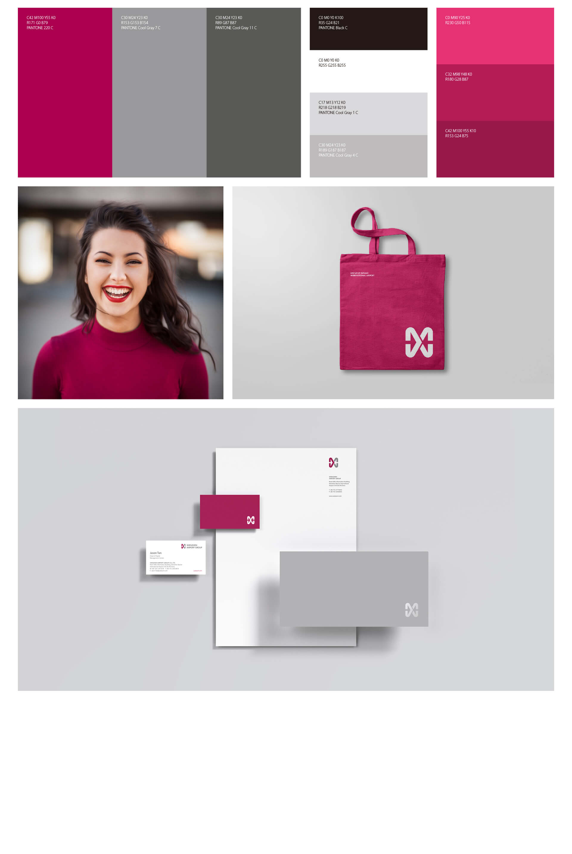 我们从年轻一代思潮特点和机场定位的角度出发,标志色彩使用暖洋红与科技灰的搭配,红色时尚、活力,灰色稳重,展现科技感和未来感。